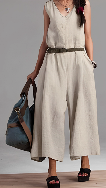 Mono de lino de algodón sin mangas y cuello en V para mujer