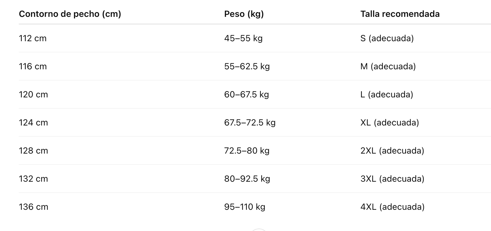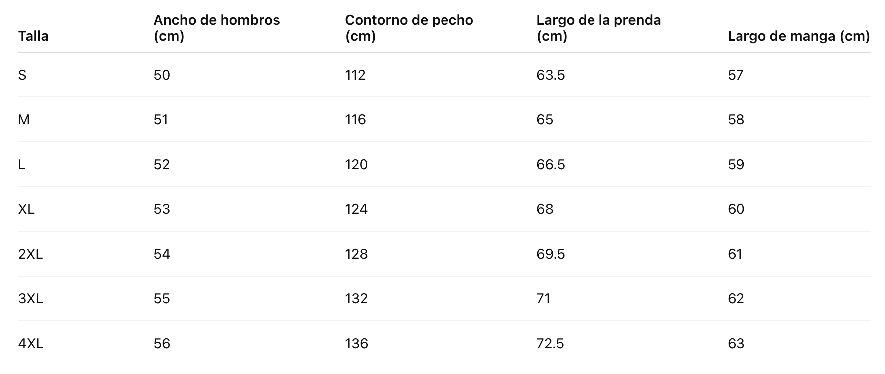 Talla Ancho de hombros (cm) Contorno de pecho (cm) Largo de la prenda (cm) Largo de manga (cm)