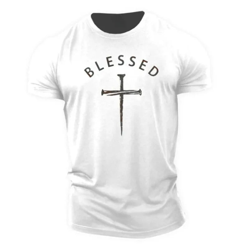 This men's t-shirt combines soft, comfortable cotton with a slim-fit design that flatters the figure, ideal for a stylish casual look. Its 3D digital print with the message "Blessed" and a cross adds a modern and meaningful touch, perfect for everyday wear, casual outings, or for those looking to express their personality through fashion. 👕✨