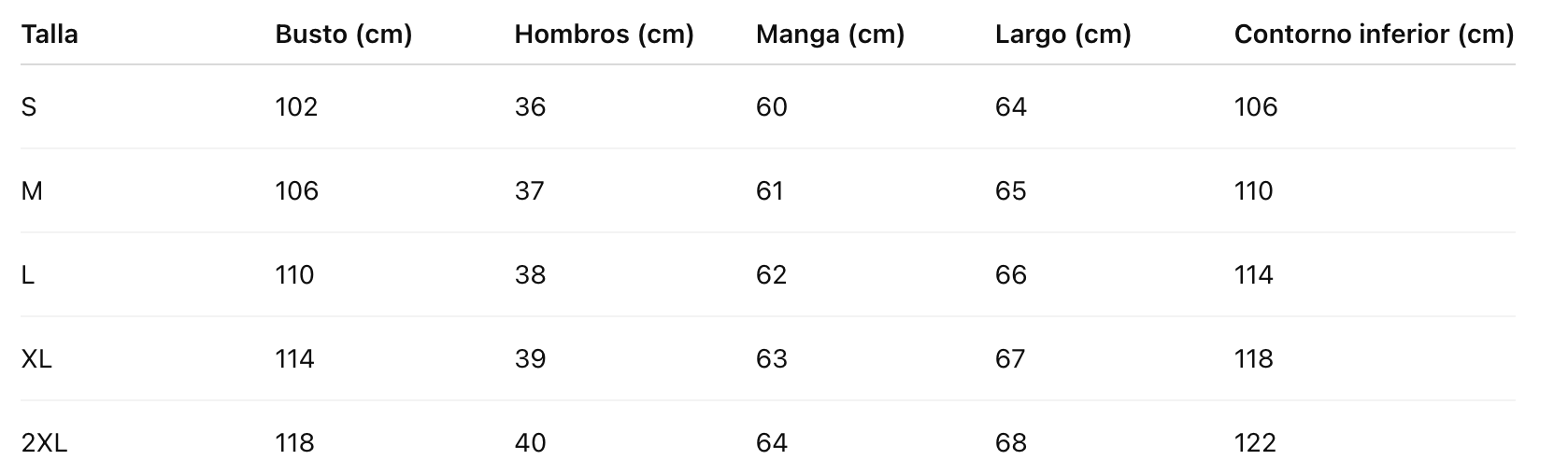 Talla Busto (cm) Hombros (cm) Manga (cm) Largo (cm) Contorno inferior (cm)
