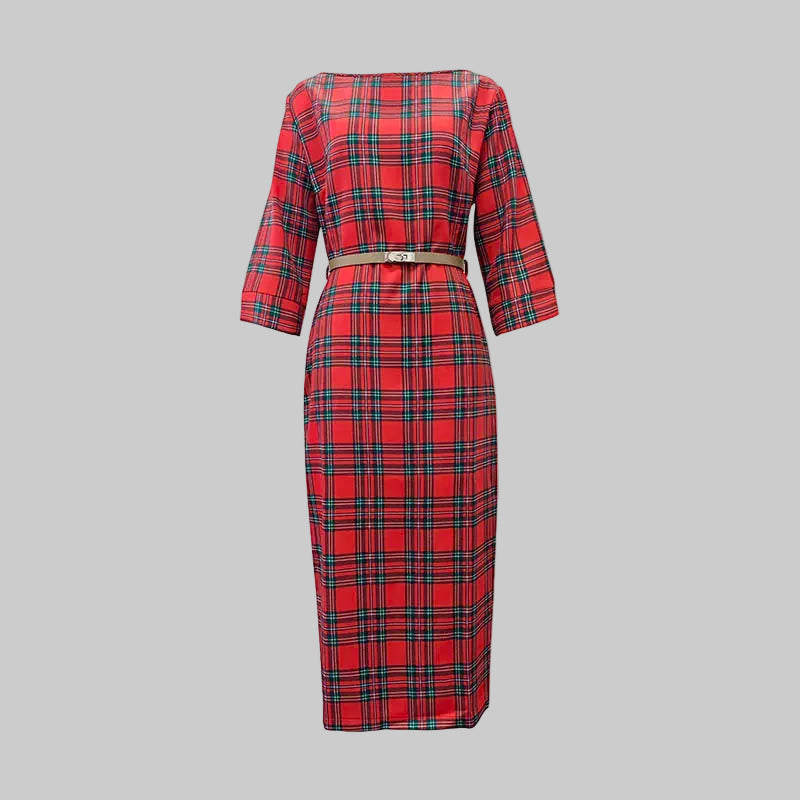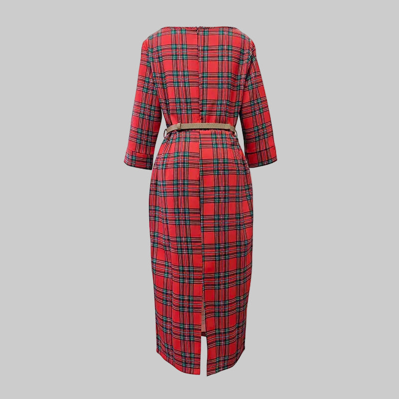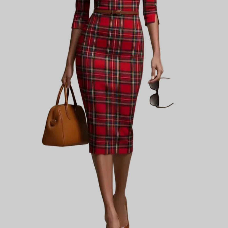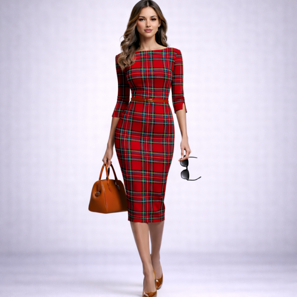 Este vestido rojo de cuadros combina elegancia atemporal y un ajuste favorecedor que realza la silueta con sofisticación. Su corte midi entallado, mangas tres cuartos y cinturón fino aportan estructura y comodidad, ideal para looks de oficina, eventos formales o reuniones especiales. Un diseño versátil que eleva tu estilo con un toque clásico y femenino.