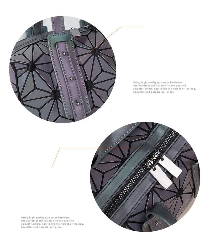 Este bolso geométrico luminoso con efecto láser destaca por su diseño moderno y sofisticado que cambia de tonalidad según la luz, creando un impacto visual único. Sus paneles geométricos estructurados y su acabado brillante lo convierten en el complemento perfecto para mujeres que aman la moda vanguardista y desean destacar tanto de día como de noche. Gracias a su asa superior y correa ajustable, es ideal para llevar al hombro o cruzado, combinando estilo, comodidad y funcionalidad en un solo accesorio.