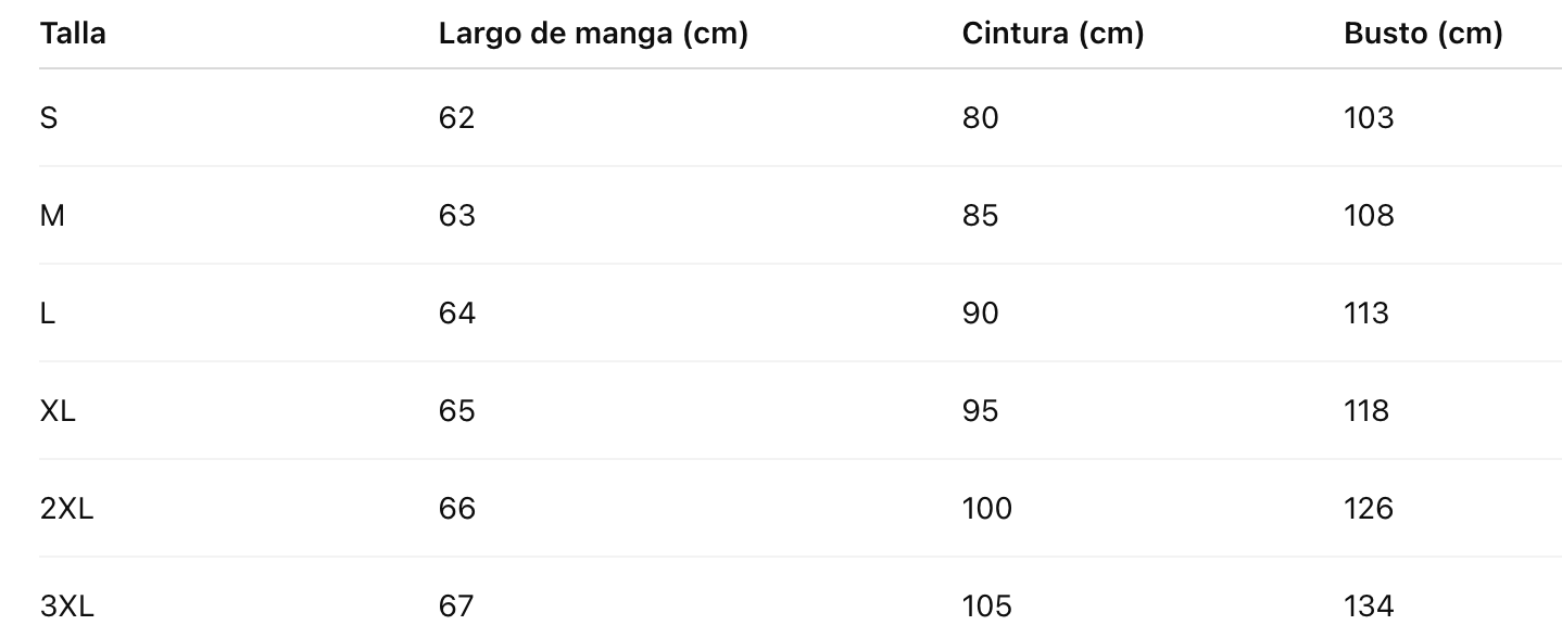 Talla Largo de manga (cm) Cintura (cm) Busto (cm)