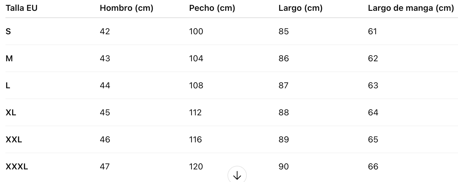 Talla EU Hombro (cm) Pecho (cm) Largo (cm) Largo de manga (cm)
