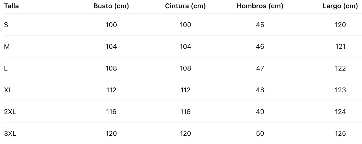 Talla Busto (cm) Cintura (cm) Hombros (cm) Largo (cm)