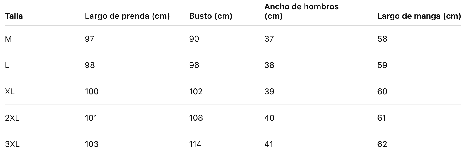 Talla Largo de prenda (cm) Busto (cm) Ancho de hombros (cm) Largo de manga (cm)
