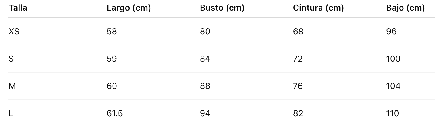 Talla Largo (cm) Busto (cm) Cintura (cm) Bajo (cm)