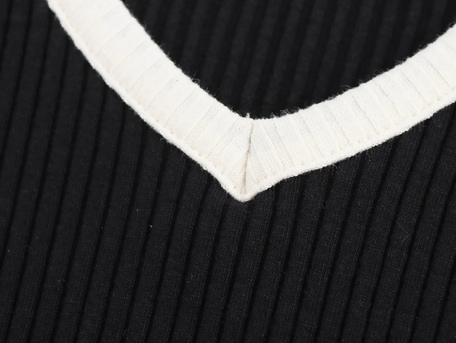 Este suéter con cuello en V y mangas largas combina elegancia y comodidad en un diseño moderno con delicados volantes en el bajo y los puños. Su tejido suave y corte favorecedor lo convierten en una prenda perfecta para looks casuales o más sofisticados, ideal para quienes buscan estilo sin renunciar al confort. ✨