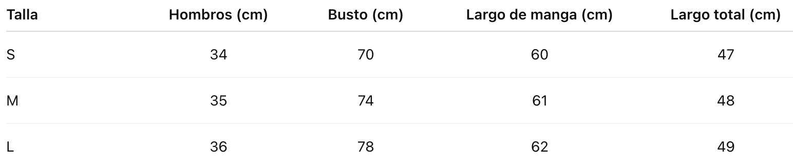 Talla Hombros (cm) Busto (cm) Largo de manga (cm) Largo total (cm)