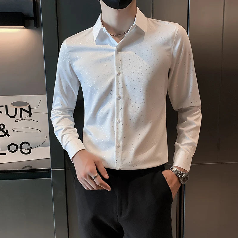✨ Esta camisa casual para hombre destaca por su diseño moderno con estampado de estrellas, que aporta un toque elegante y sofisticado a cualquier look. Su tejido suave y corte ajustado garantizan comodidad y estilo, ideal tanto para eventos nocturnos como para ocasiones informales con un aire refinado. Perfecta para el hombre que busca destacar con distinción y buen gusto. 🌟