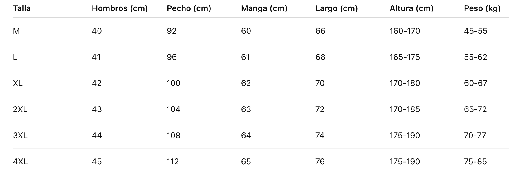 Talla Hombros (cm) Pecho (cm) Manga (cm) Largo (cm) Altura (cm) Peso (kg)
