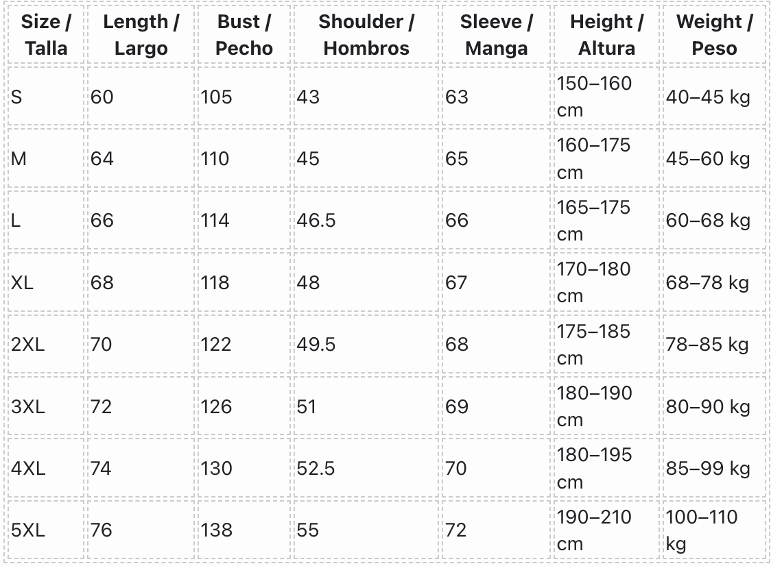 Size / Talla Length / Largo Bust / Pecho Shoulder / Hombros Sleeve / Manga Height / Altura Weight / Peso