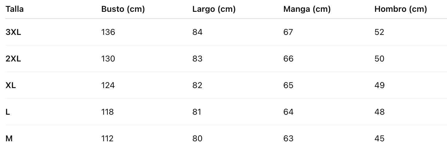 Talla Busto (cm) Busto (pulg) Largo (cm) Largo (pulg) Manga (cm) Manga (pulg) Hombro (cm) Hombro (pulg)