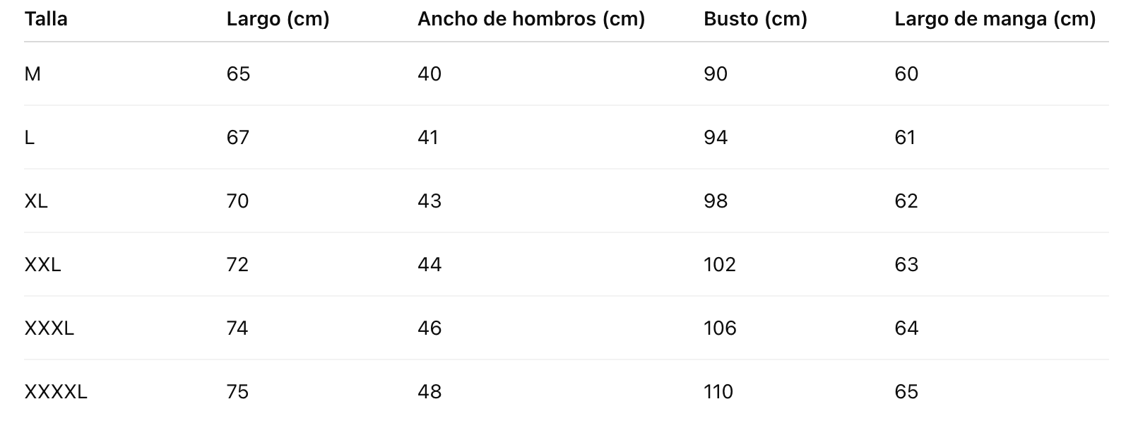 Talla Largo (cm) Ancho de hombros (cm) Busto (cm) Largo de manga (cm)