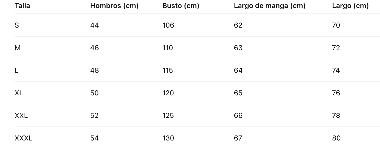 Talla Hombros (cm) Busto (cm) Largo de manga (cm) Largo (cm)