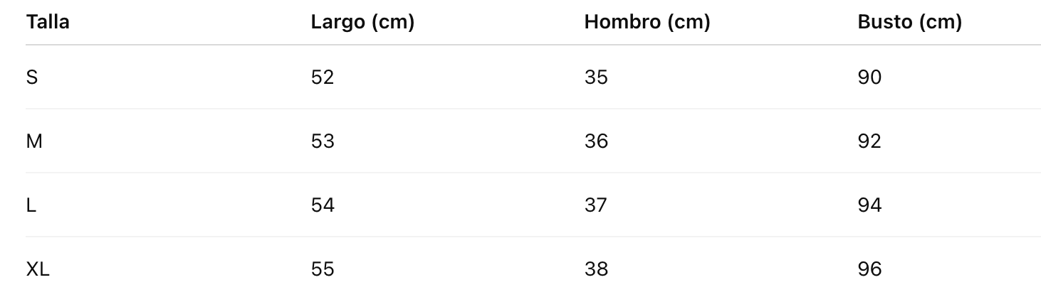 Talla Largo (cm) Hombro (cm) Busto (cm)