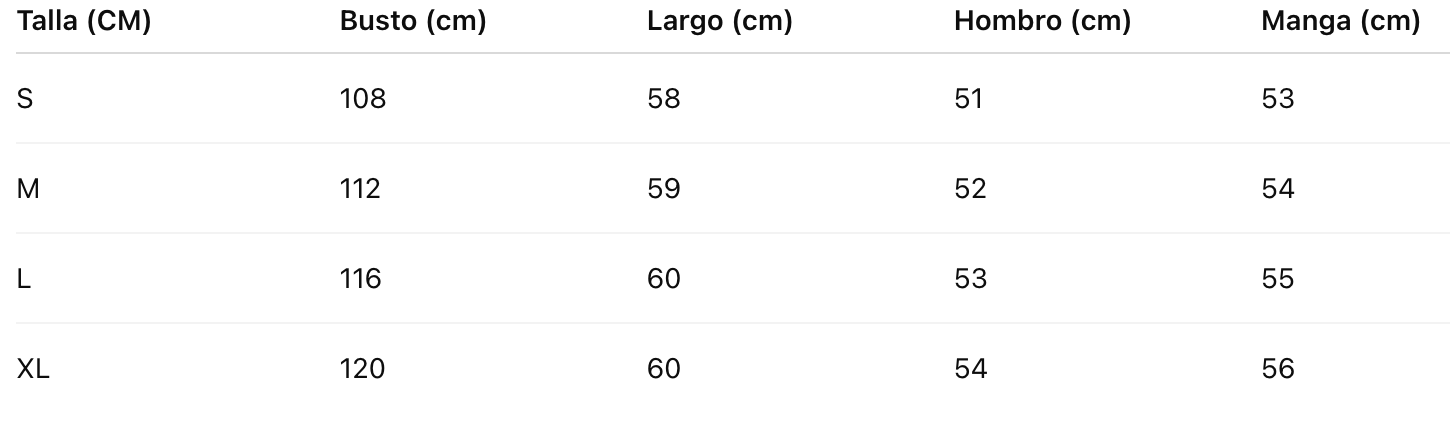 Talla (CM) Busto (cm) Largo (cm) Hombro (cm) Manga (cm)
