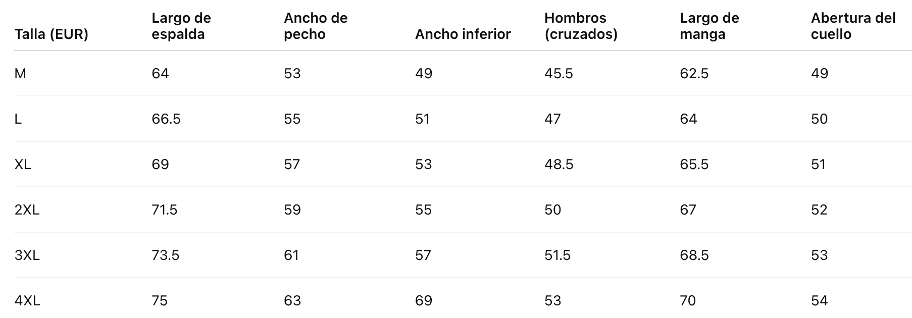 Talla (EUR) Largo de espalda Ancho de pecho Ancho inferior Hombros (cruzados) Largo de manga Abertura del cuello