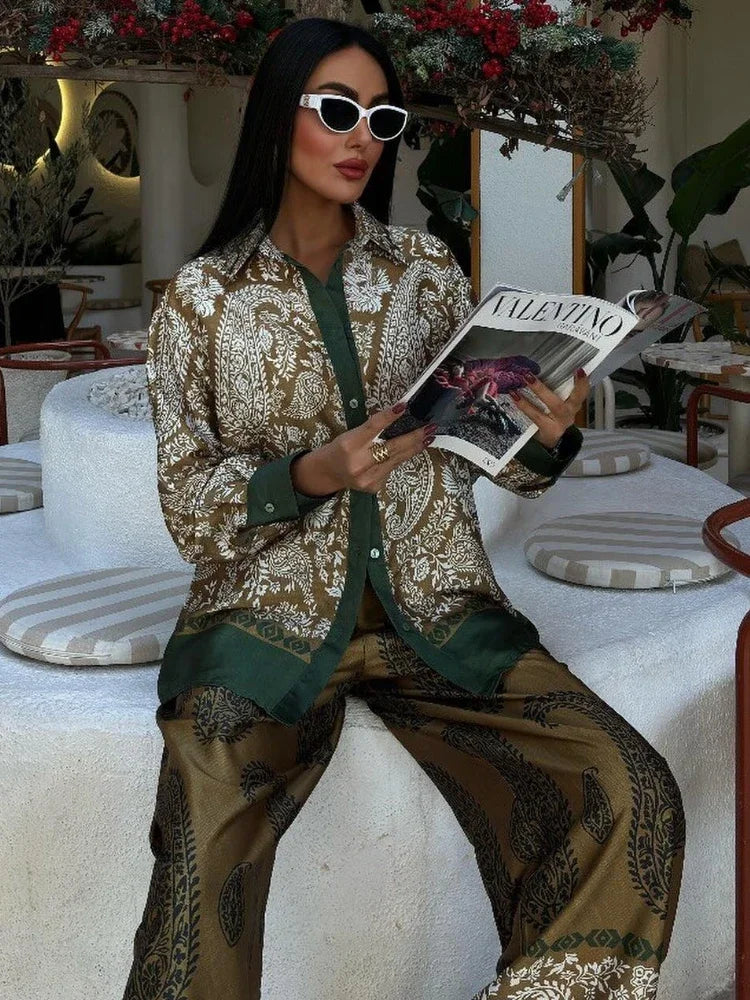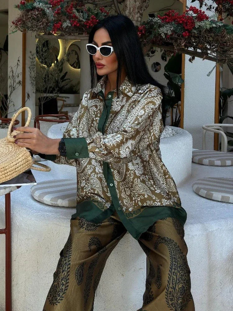 Este conjunto de camisa estampada de manga larga y pantalones de pierna ancha ofrece una combinación perfecta de comodidad y elegancia. Su diseño fluido y moderno permite moverse con libertad mientras resalta la figura de manera sofisticada. Ideal para mujeres que buscan un look versátil y con estilo tanto para el día como para la noche. 💫