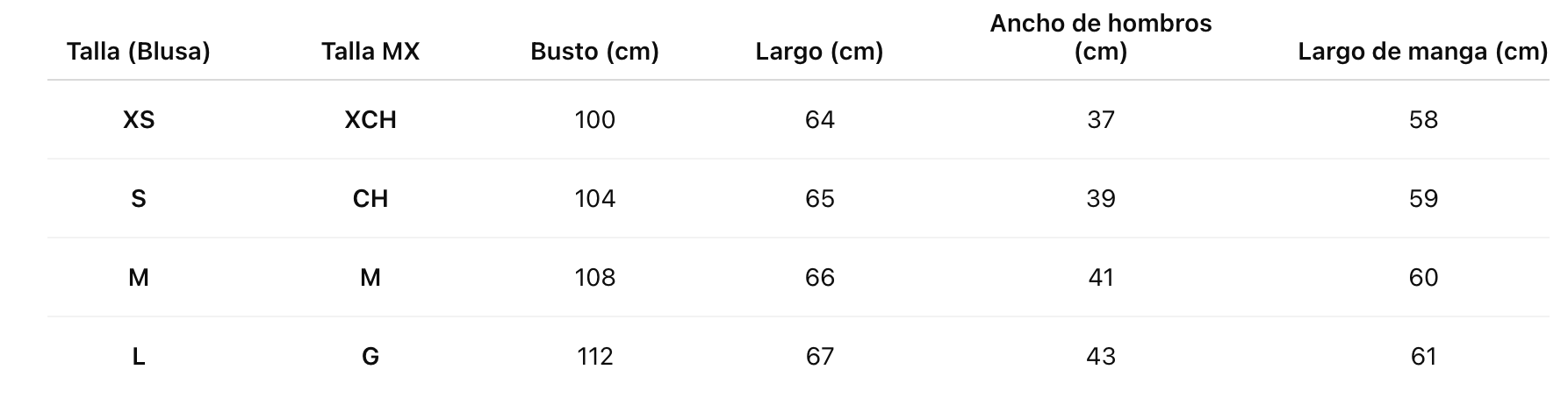 Talla (Blusa) Talla MX Busto (cm) Largo (cm) Ancho de hombros (cm) Largo de manga (cm)