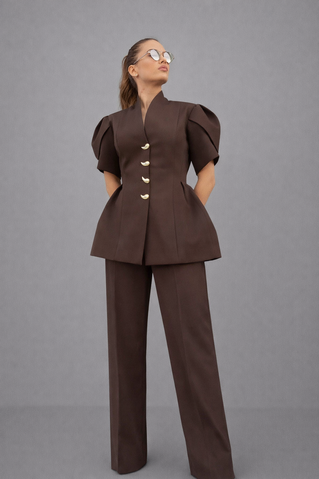 Este conjunto femenino de top y pantalón combina elegancia moderna y comodidad en un diseño impecable, con blusa de manga corta abullonada, botones dorados y pantalón largo recto que estiliza la figura. Su corte favorecedor y estilo minimalista lo hacen ideal para mujeres que buscan un look sofisticado pero relajado, perfecto para oficina, eventos, cenas o looks urbanos con clase.