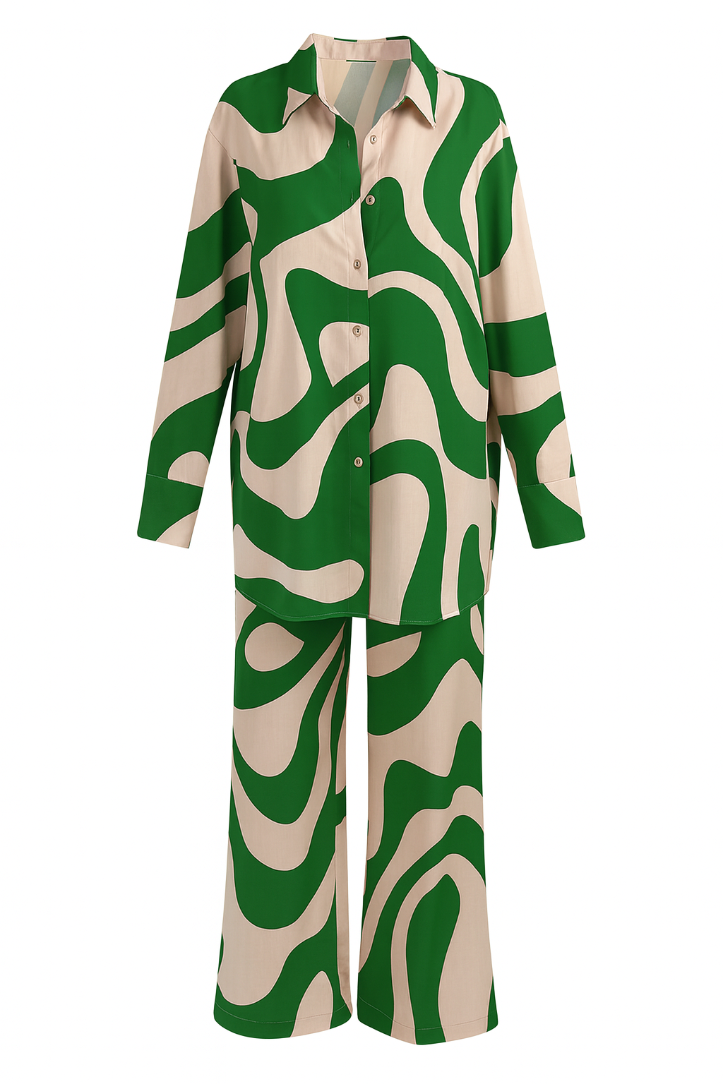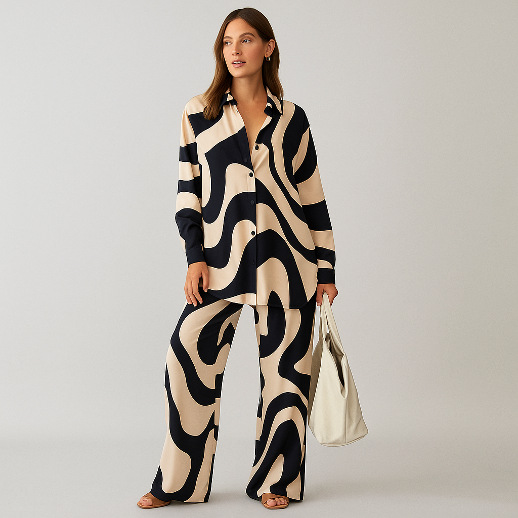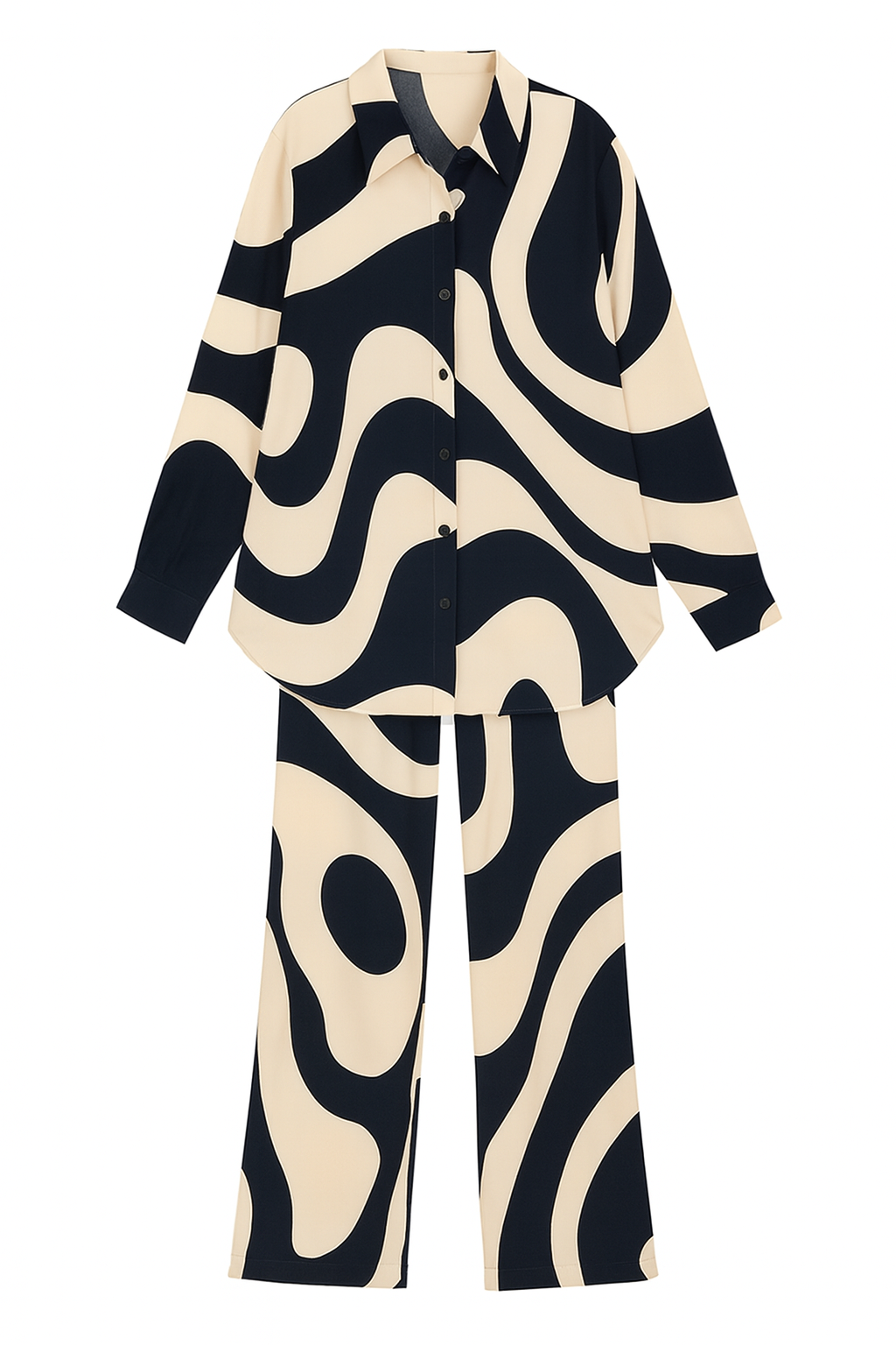 Este conjunto de dos piezas combina una camisa larga de corte fluido con pantalones holgados de estampado moderno, ofreciendo comodidad y estilo en un solo look. Perfecto para salidas casuales, viajes o un día relajado, su diseño versátil permite lucir sofisticada sin perder frescura. Ideal para mujeres que buscan un outfit cómodo y lleno de personalidad.