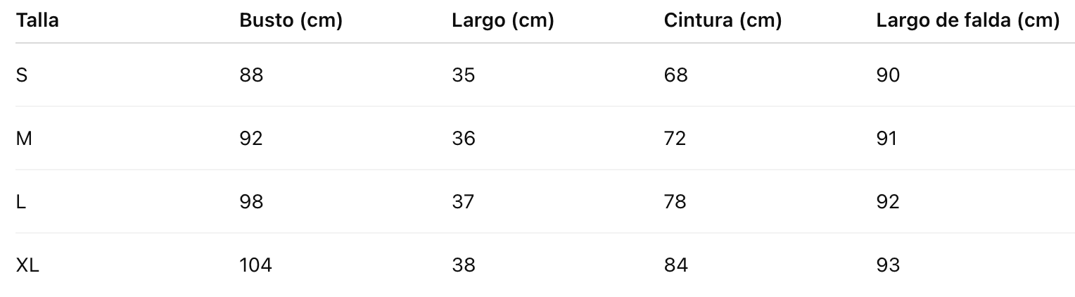 Talla Busto (cm) Largo (cm) Cintura (cm) Largo de falda (cm)