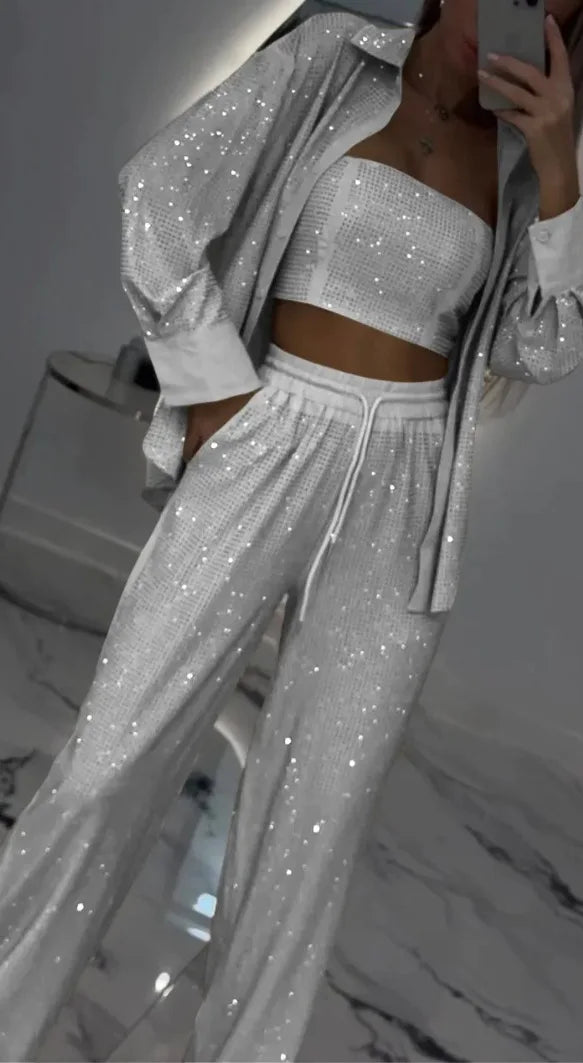 Destaca en cualquier evento con este conjunto negro de lentejuelas de tres piezas para mujer, diseñado para brillar con elegancia y seguridad. Incluye top bandeau sin tirantes, pantalón de pierna ancha con cintura elástica y chaqueta oversize, creando un look moderno, favorecedor y lleno de glamour.