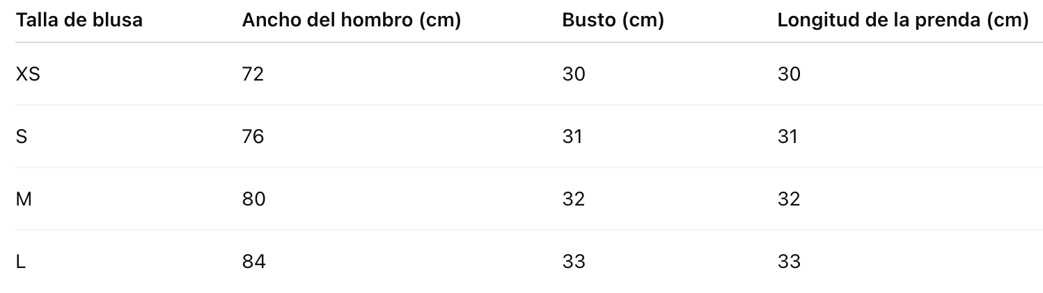 Talla de blusa Ancho del hombro (cm) Busto (cm) Longitud de la prenda (cm)