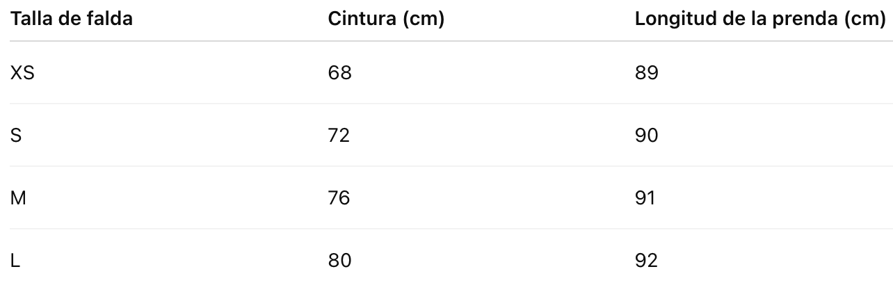 Talla de falda Cintura (cm) Longitud de la prenda (cm)