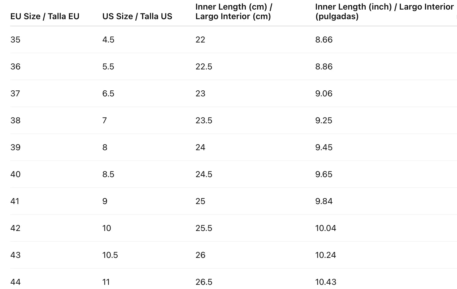 Nuestra página de "Guía de Tallas" proporciona medidas detalladas para cada producto y tambien puede encontrar medidas más especifica de cada producto en el apartado de " descrpicion caracteristicas". Siempre recomendamos escoger 1 talla más de la habitual, tanto en calzado como en prendas de vestir.