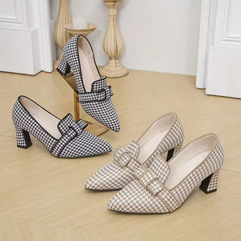 Estos zapatos de tacón para mujer combinan el clásico estampado pata de gallo con un elegante lazo decorativo, creando un look sofisticado y atemporal. Su puntera fina estiliza el pie y el tacón bajo y ancho aporta estabilidad y comodidad, ideales para el trabajo, eventos o para elevar un outfit diario con un toque chic.