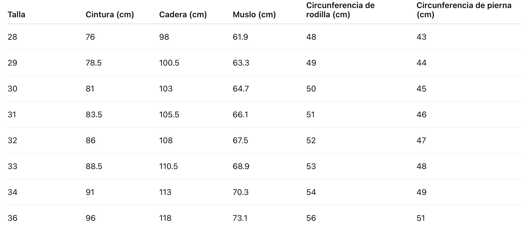 Talla Cintura (cm) Cadera (cm) Muslo (cm) Circunferencia de rodilla (cm) Circunferencia de pierna (cm)