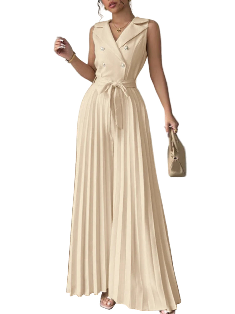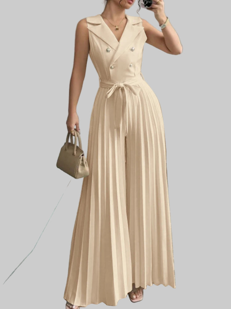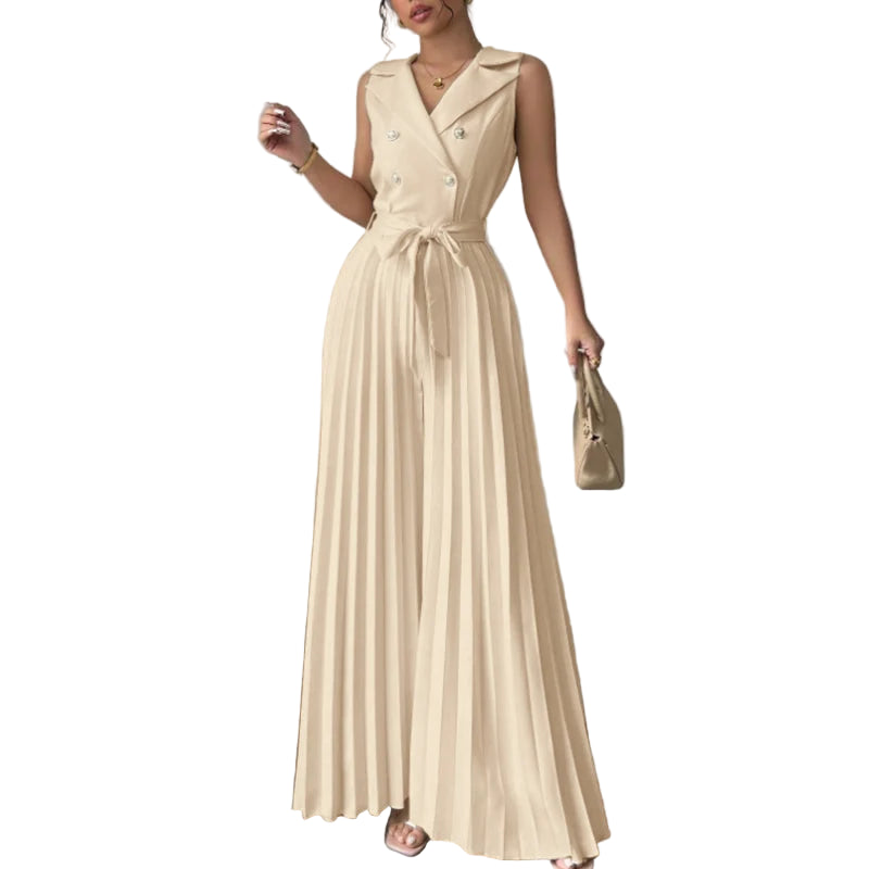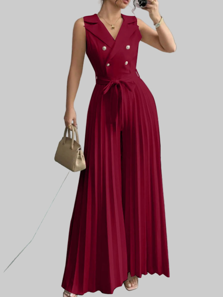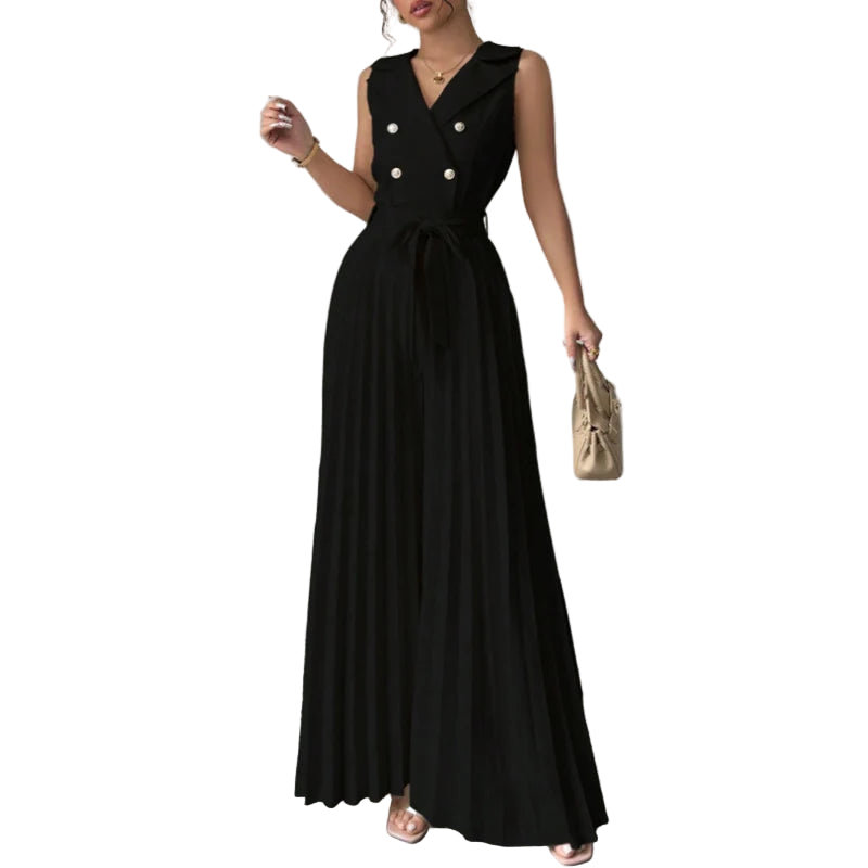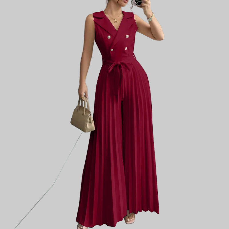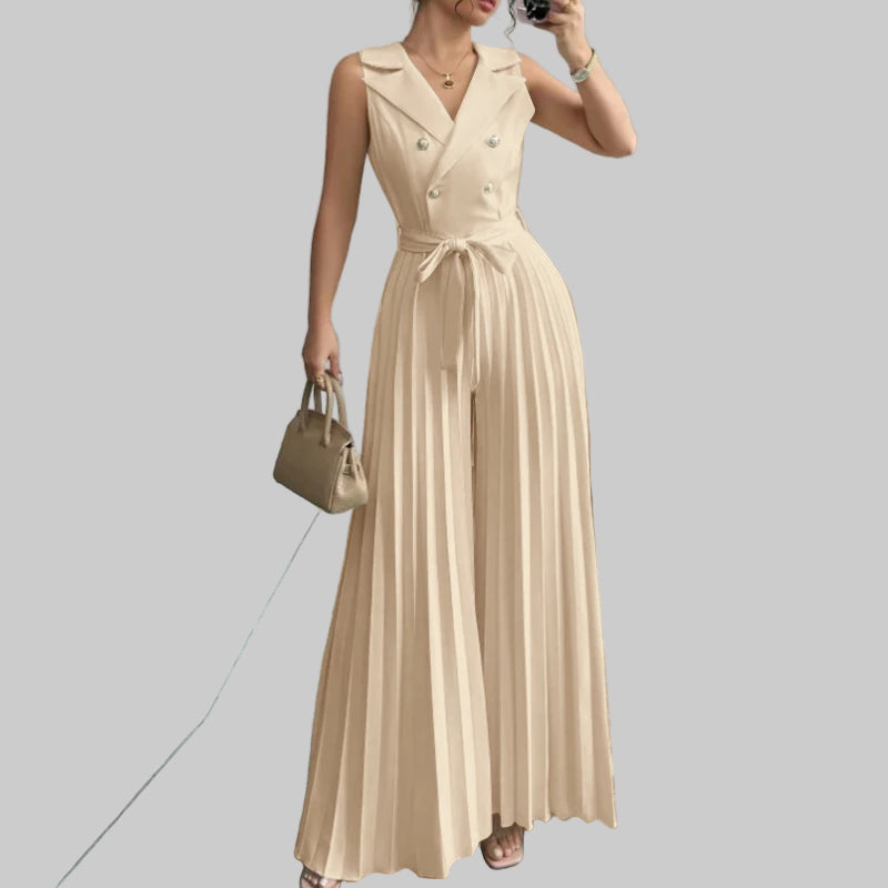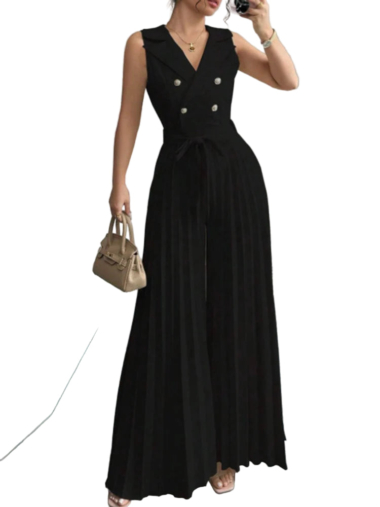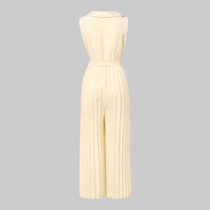 Este elegante mono de verano combina comodidad y sofisticación en una sola prenda. Su diseño sin mangas con cuello en V realza la figura, mientras que el pantalón de pierna ancha plisada ofrece frescura y libertad de movimiento, ideal para días cálidos y ocasiones especiales. Perfecto para mujeres modernas que buscan un look refinado y versátil.