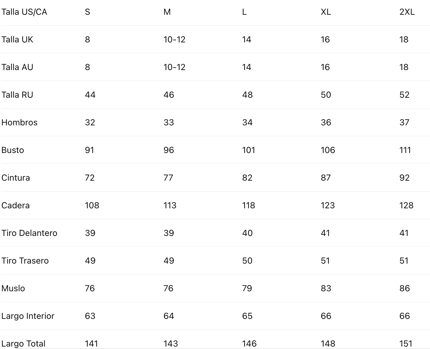 Talla Etiqueta S M L XL 2XL