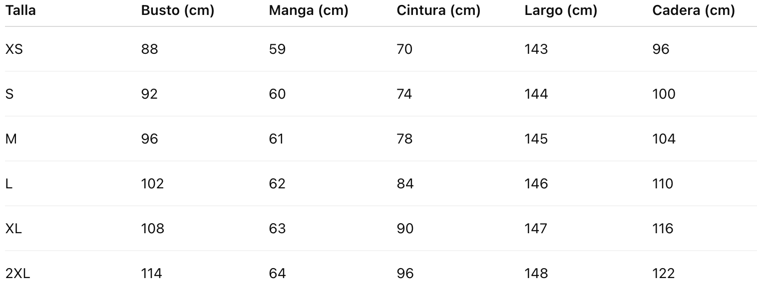 Talla Busto (cm) Manga (cm) Cintura (cm) Largo (cm) Cadera (cm)