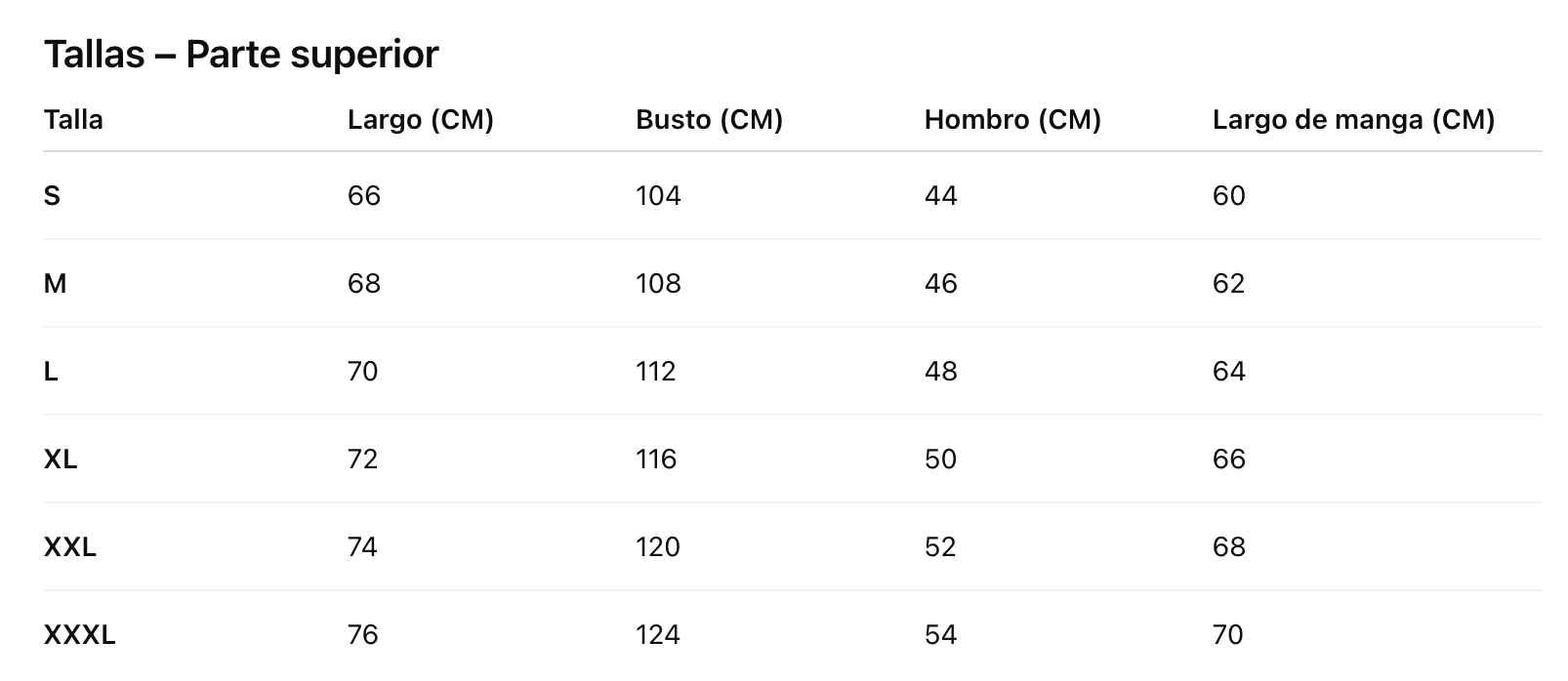 Talla Largo (CM) Busto (CM) Hombro (CM) Largo de manga (CM)