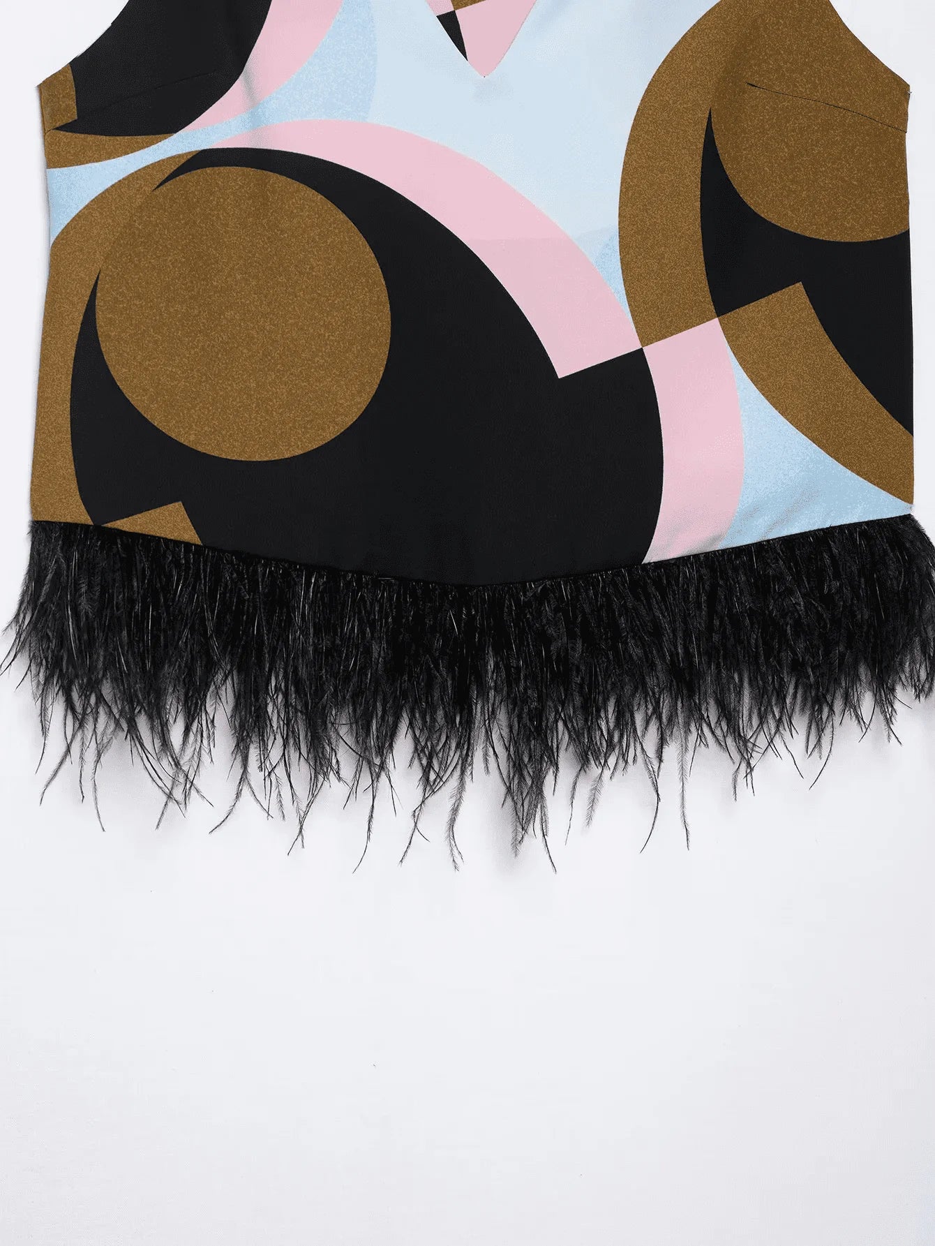 ✨ Este conjunto de dos piezas con estampado geométrico combina originalidad y estilo moderno para destacar en cualquier ocasión. El detalle de plumas añade un toque sofisticado y glamuroso, mientras que su diseño cómodo y llamativo lo hace ideal para mujeres seguras y con actitud. Perfecto para eventos, cenas o salidas donde quieras brillar con elegancia y personalidad. 💃✨