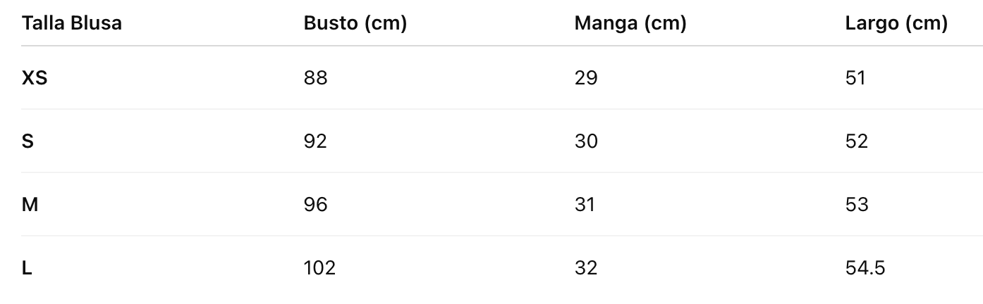 Talla Blusa Busto (cm) Manga (cm) Largo (cm)