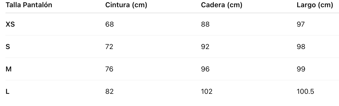 Talla Pantalón Cintura (cm) Cadera (cm) Largo (cm)