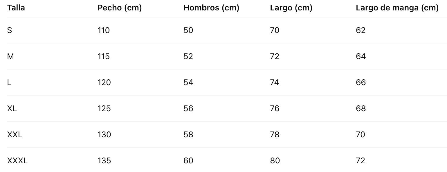 Talla Pecho (cm) Hombros (cm) Largo (cm) Largo de manga (cm)
