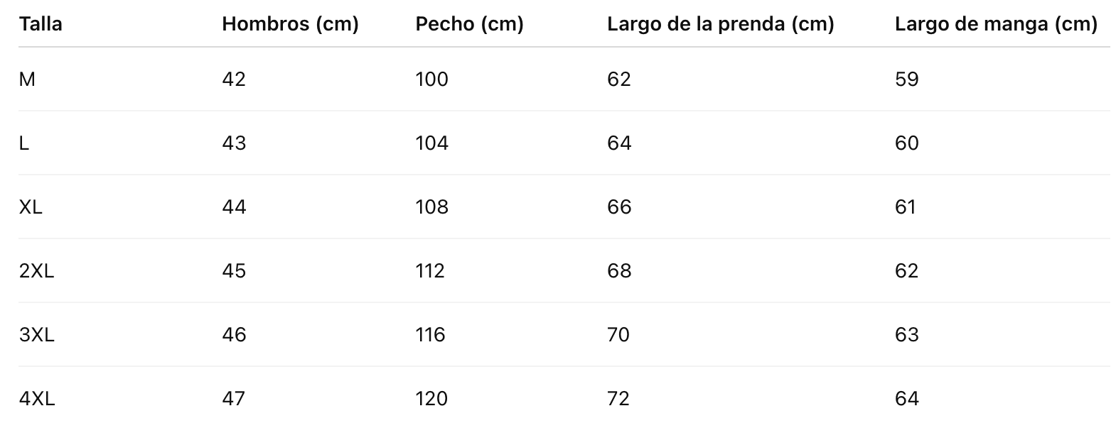 Talla Hombros (cm) Pecho (cm) Largo de la prenda (cm) Largo de manga (cm)