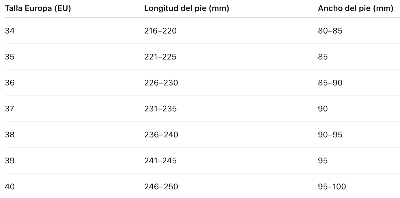 Talla Europa (EU) Longitud del pie (mm) Ancho del pie (mm)