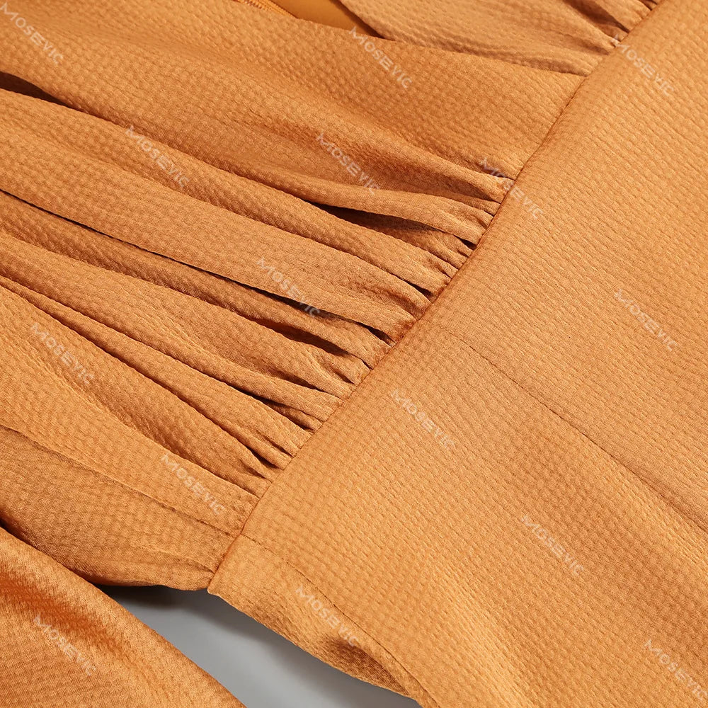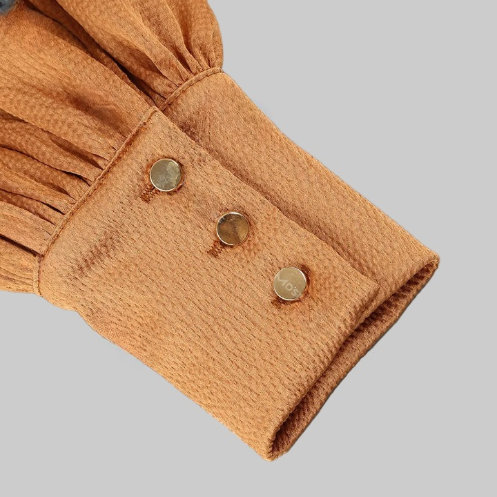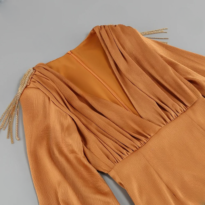 ✨ Este impresionante vestido largo en tono dorado combina elegancia y sensualidad con un diseño sofisticado. Su profundo escote en V y mangas acampanadas con detalles decorativos realzan la silueta femenina, mientras la abertura lateral añade un toque audaz y glamuroso. Ideal para eventos, galas o celebraciones donde quieras destacar con estilo y distinción. 💫