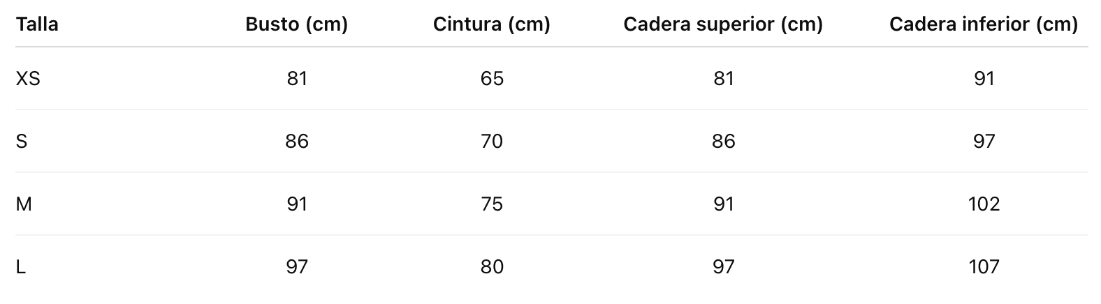 Talla Busto (cm) Cintura (cm) Cadera superior (cm) Cadera inferior (cm)