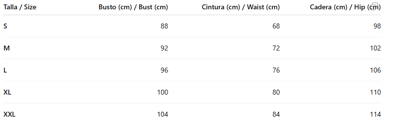 Aceptamos devoluciones y cambios dentro de un plazo de 14 días. Hacemos devoluciones si el producto tiene algún defecto. Para garantizar una experiencia de compra sin contratiempos, es importante revisar nuestras tablas de medidas antes de realizar el pedido. En caso de devolución debido a discrepancias en las medidas, los costos asociados serán responsabilidad del cliente. Consulta nuestra política de devoluciones en nuestro sitio web para obtener más información.