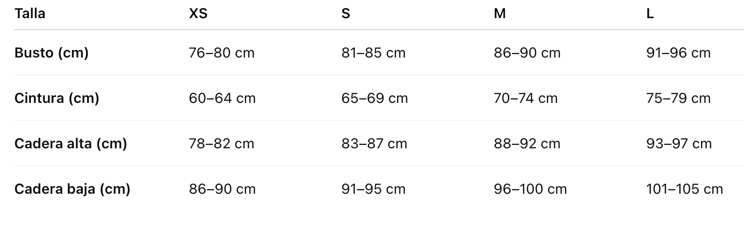 Busto (cm) 76–80 cm 81–85 cm 86–90 cm 91–96 cm