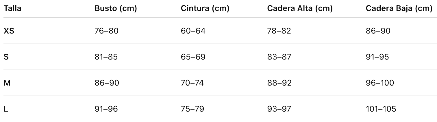Talla Busto (cm) Cintura (cm) Cadera Alta (cm) Cadera Baja (cm)