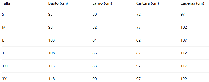 Talla Busto (cm) Largo (cm) Cintura (cm) Caderas (cm)