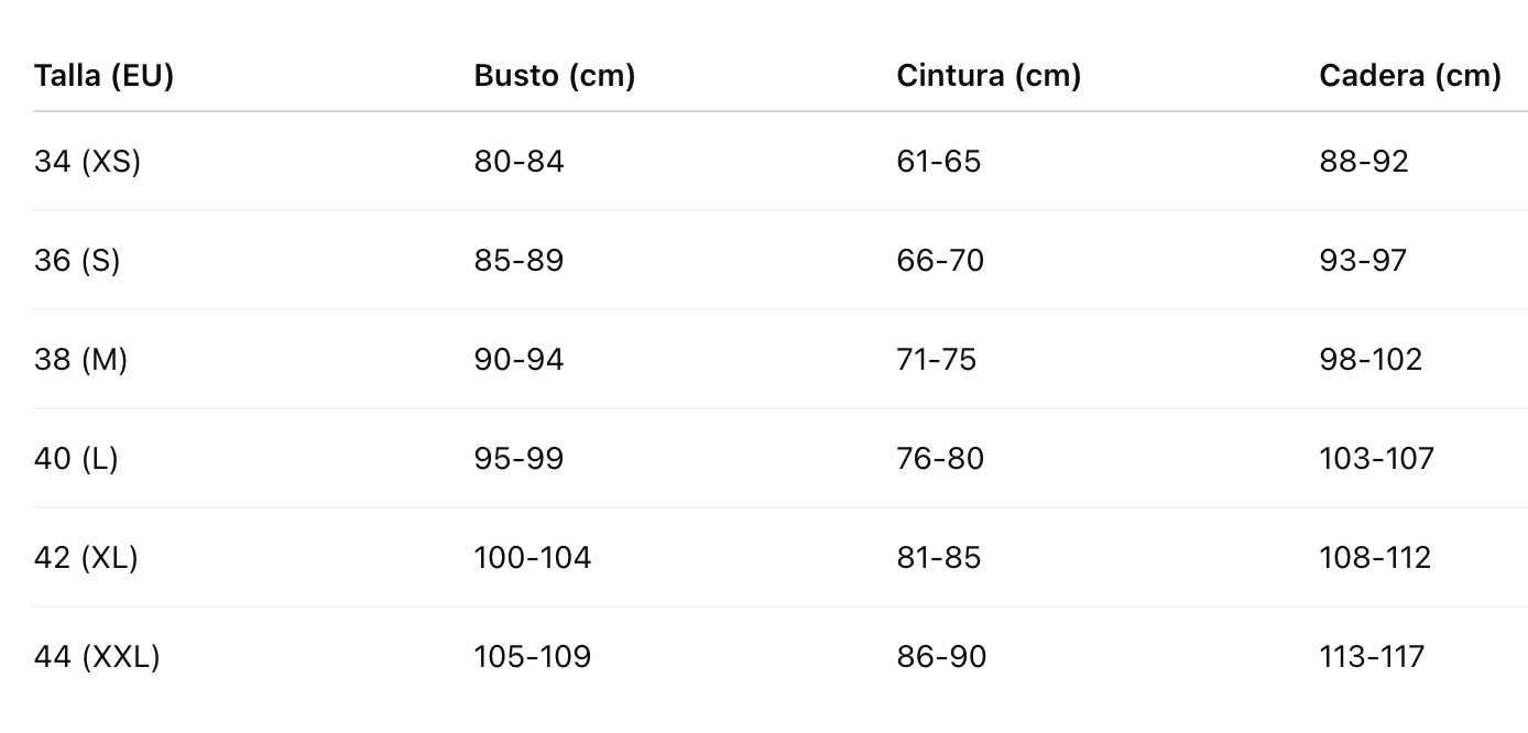 Talla (EU) Busto (cm) Cintura (cm) Cadera (cm)